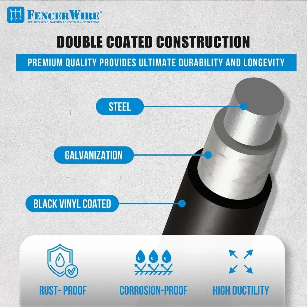 SIZE AND SPECIFICATIONS: This welded wire mesh features a 1.5-inch by 1.5-inch grid opening, with dimensions of 4 feet in height and 50 feet in length. It is constructed from durable 16-gauge galvanized steel wire, ensuring strength and longevity for various applications around your home and garden. DURABLE CONSTRUCTION: The wire is coated with a black vinyl layer that provides enhanced rust resistance and weather protection. This double coating helps the mesh withstand outdoor elements, making it ideal for long-term use without deterioration. VERSATILE APPLICATIONS: Use this flexible wire mesh for property dividers, animal enclosures, garden fencing, or protective covers. Its tight weave effectively keeps out small animals and pests while allowing air and light to pass through. EASY INSTALLATION AND USE: The roll design allows for quick unrolling and customization to fit your specific needs. You can easily cut and shape the mesh using standard tools for projects like cages, trellises, or decorative elements. QUALITY ASSURANCE: We are committed to providing high-quality products that meet your expectations. Our customer support team is available to assist with any questions or concerns you may have about this item.