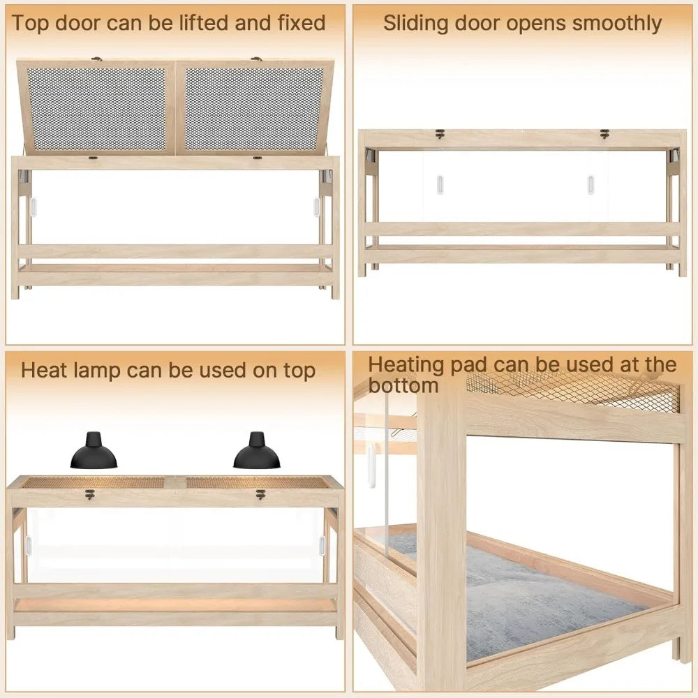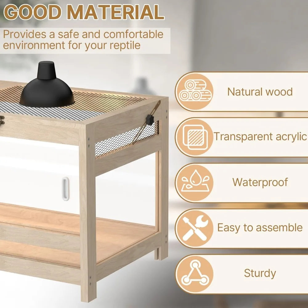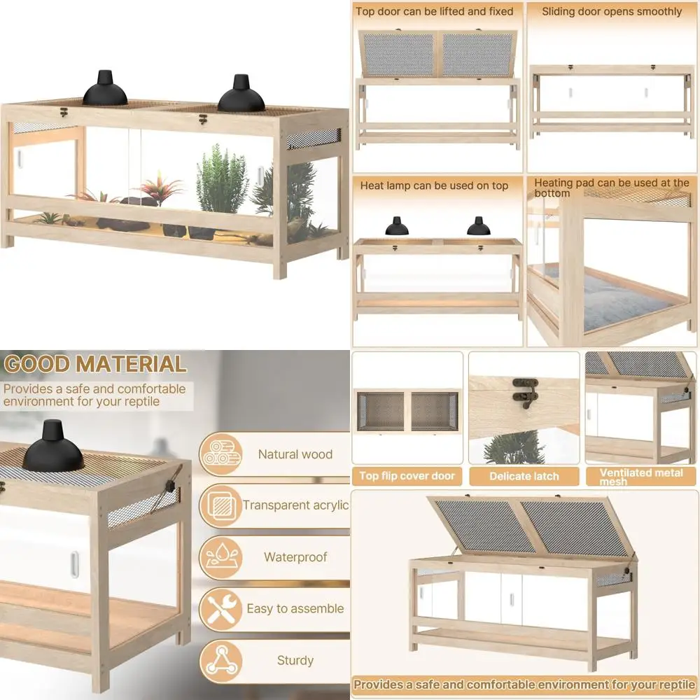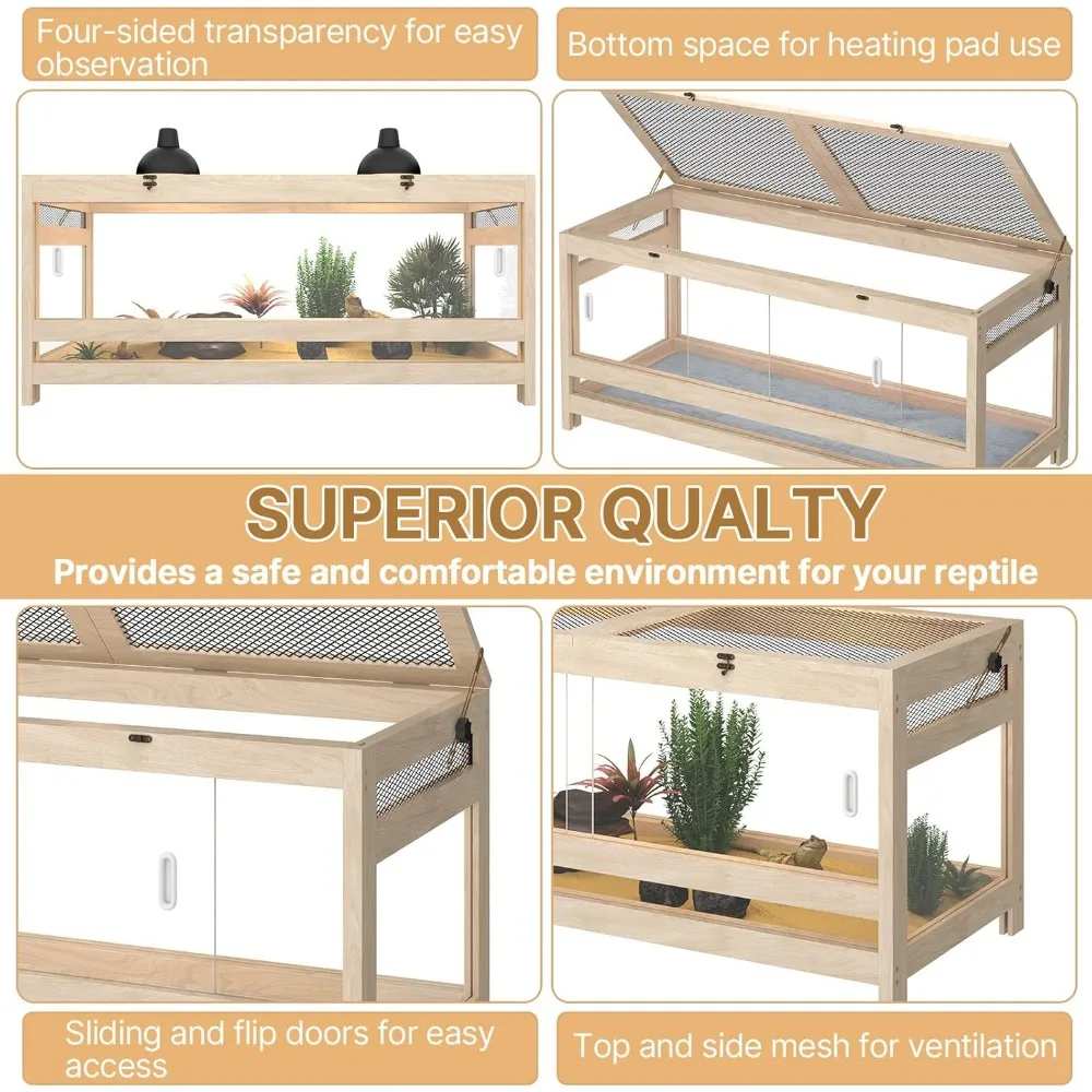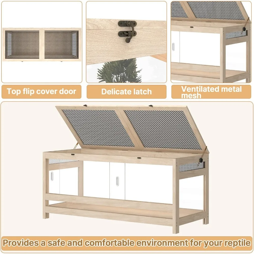 This product is a spacious 80-gallon reptile enclosure, measuring 47.2 inches by 21.2 inches by 20 inches, designed to provide a generous habitat for reptiles such as bearded dragons, snakes, and geckos. The enclosure's dimensions offer ample space for basking, climbing, and hiding, which encourages a healthy and active lifestyle for the pets. The reptile habitat features four clear acrylic panels that ensure maximum visibility and interaction. This design allows owners to easily monitor their pet's behavior while the pets can enjoy an unobstructed view of their surroundings, creating a stress-free environment. The enclosure comes with a ventilated mesh flip-top lid that provides excellent airflow, helping to regulate humidity and temperature. This lid also ensures that UVB lighting penetrates effectively, making it suitable for use with heat lamps or full-spectrum lights. The secure latch on the lid prevents escape, giving owners peace of mind. Built with a durable natural wood frame, this bearded dragon enclosure is eco-friendly and stable. The smooth surfaces and wide access points facilitate cleaning and feeding, while the deep acrylic base securely contains the substrate without any leaks. Assembly is quick and easy with clear instructions included. All hardware and tools are provided for a fast setup. This habitat is designed to combine style, function, and comfort for both pets and owners, making it suitable for use as a snake terrarium, bearded dragon tank, or a large reptile enclosure.