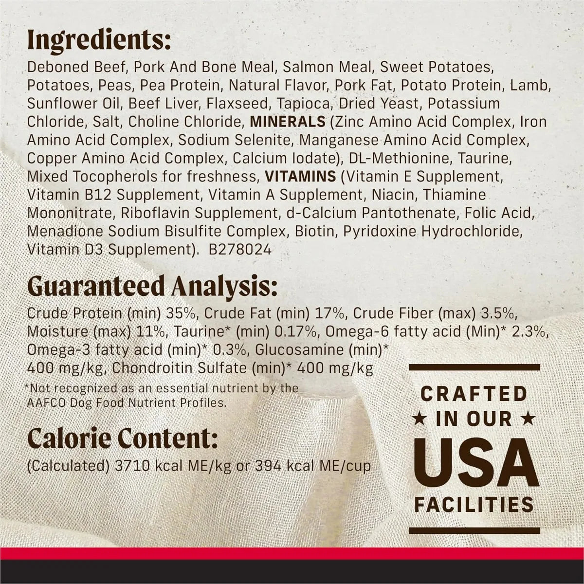 Connect your dog to an ancestral diet with Merrick Backcountry Grain Free Dog Food, Great Plains Red Meat Recipe. Real deboned beef is the first ingredient in this natural, with added vitamins, minerals, and nutrients, chicken free, and high protein dog food that helps maintain lean muscle mass and healthy energy levels. This real meat dog food with beef and lamb contains a holistic blend of kibble and freeze-dried raw pieces inspired by an ancestral canine diet and is crafted to provide the taste of raw dog food in a convenient recipe. Additionally, there are high levels of Omega fatty acids in this premium dry dog food to nourish your dog’s skin and coat, as well as glucosamine and chondroitin to support healthy hips and joints. Backcountry Grain Free dry dog food is gluten free and poultry free for a wholesome and healthy dog food option. Merrick Backcountry dog food recipes are proudly founded in Hereford, Texas, crafted in USA facilities.