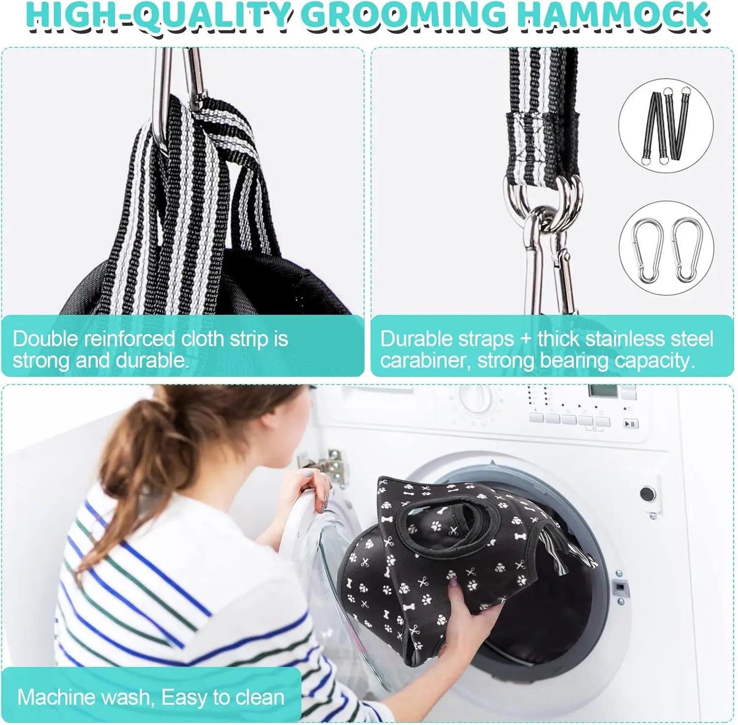 [ Dog Grooming Hammock Kit ]: Nail clipper x 1, Nail file x 1, Pet comb x 1 (rounded ends stainless steel teeth), Hanging Sling x 2(suitable for the irregular bar), Carabiner x 2 (compared with other S-shaped hooks, our carabiners will not deform or break, which are more durable and Safety).