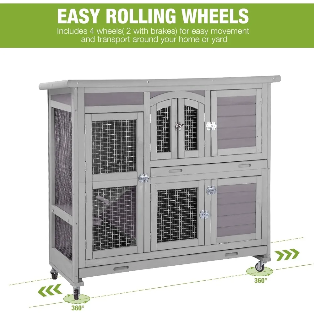 Rabbit Hutch Indoor Outdoor Bunny House Guinea Pig Cage on Wheel with Plastic Tray 47inch
