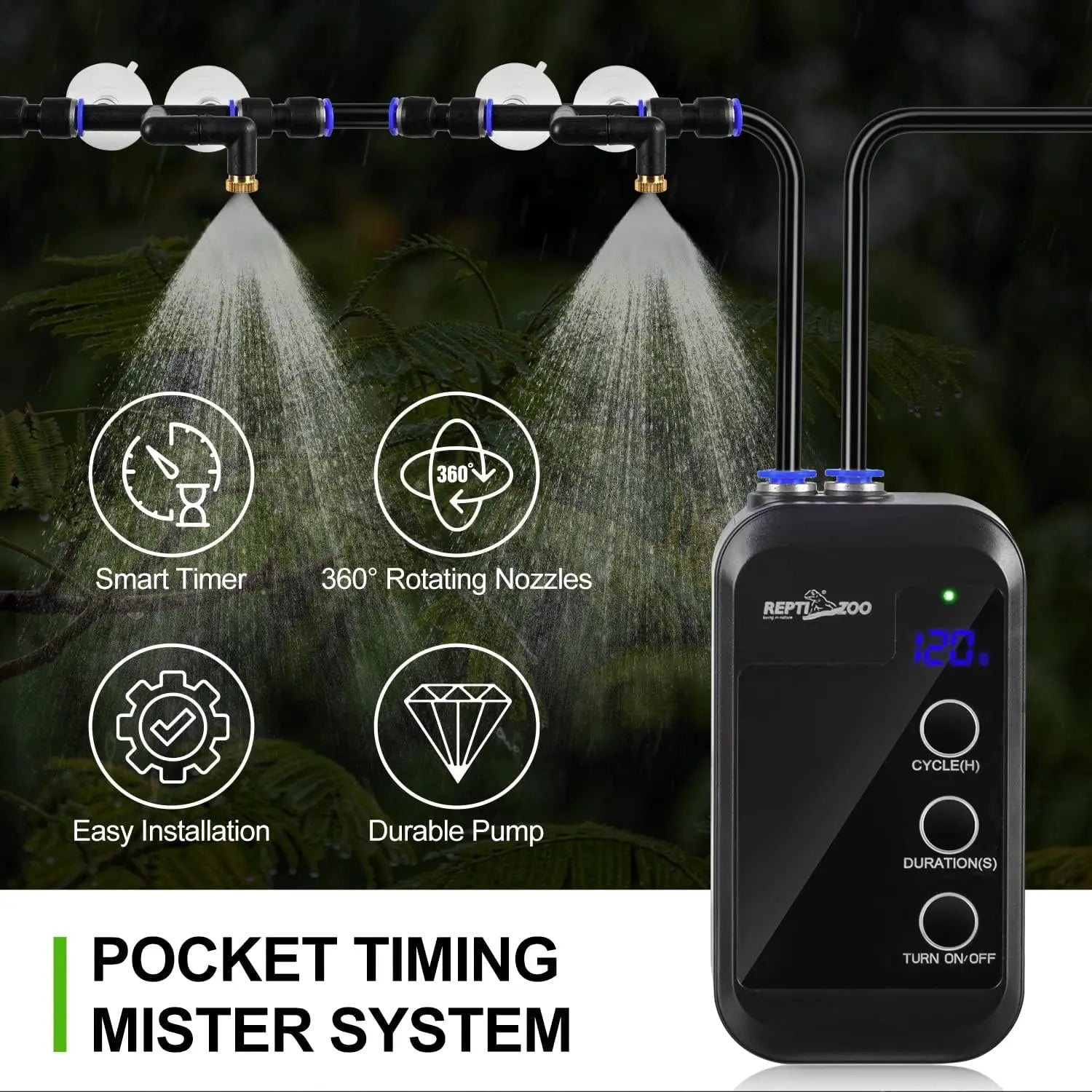 【Intelligent Circulation Reptile Misting System】With smart timing function, regular cycle spray can be set to humidify the terrarium. No worry about your reptiles when you are going out for days.And the operation is simple.